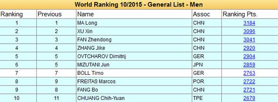新浪体育讯 北京时间10月9日消息,国际乒联更新了最新一月的世界排名,男单方面马龙高居榜首,许昕紧随其后;女单方面丁宁蝉联一姐宝座,刘诗雯仅以3分之差位列第二。