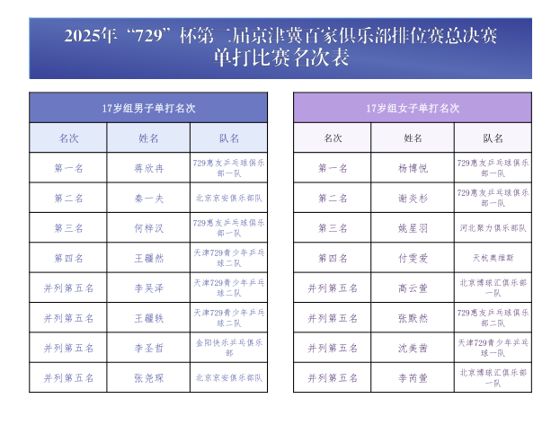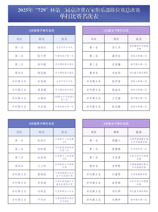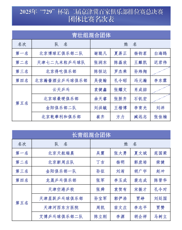 2025年7月29日, “729杯”第二届京津冀百家俱乐部排位赛总决赛在天津北辰龙顺文体中心正式落幕。本次赛事汇聚京津冀地区的140多支乒乓球队伍,加上来来往往的观众和工作人员,近乎千人参与了本次比赛。 天津市体育局、北辰区政府、渤化集团的相关领导以及京津冀三地省乒协的负责人共同出席了本次开幕式。 天津渤化橡胶有限责任公司党委书记、董事长杨永胜在致辞中,对赛事举办表示热烈祝贺,对筹备工作给予充分肯定。他指出,“729杯”京津冀百家俱乐部排位赛不仅是高水平的体育竞技平台,更是京津冀体育文化交流合作的重要纽带,对推动乒乓球运动普及发展、深化区域体育协同具有重要意义。开幕式上,京津冀三地共建仪式隆重举行。作为三地群众喜闻乐见的运动,乒乓球早已成为连接京津冀的文化纽带。此次以“共建”为契机,开启三地体育事业融合发展新篇章。 随后,市体育局、北辰区政府、渤化集团相关领导分别向京津冀乒协主席赠送象征传承、创新、共赢的“友谊之杯”,既传递出对三地协同发展的期许,也彰显“一家人、一条心、一起干”的协作精神,将推动京津冀体育事业迈向更深层次合作,以小球转动大协作,让热爱汇聚新动能。 本次赛事设成年混合团体、青少年男子单打、青少年女子单打等多个项目,最终经过三天的激烈比赛,各组别比赛都决出最终的冠军。值得一提的是,作为本次赛事的主办单位,天津七二九体育用品有限公司为比赛顺利进行付出了大量的精力,从最早的729南北挑战赛到现如今的百家俱乐部排位赛,729切实推动全民健身,让乒乓这项运动得以更广阔的传播。同时作为京津冀三地协同赛事,未来势必将会为更多的乒乓球爱好者提供良好的竞技舞台。 下附比赛成绩: